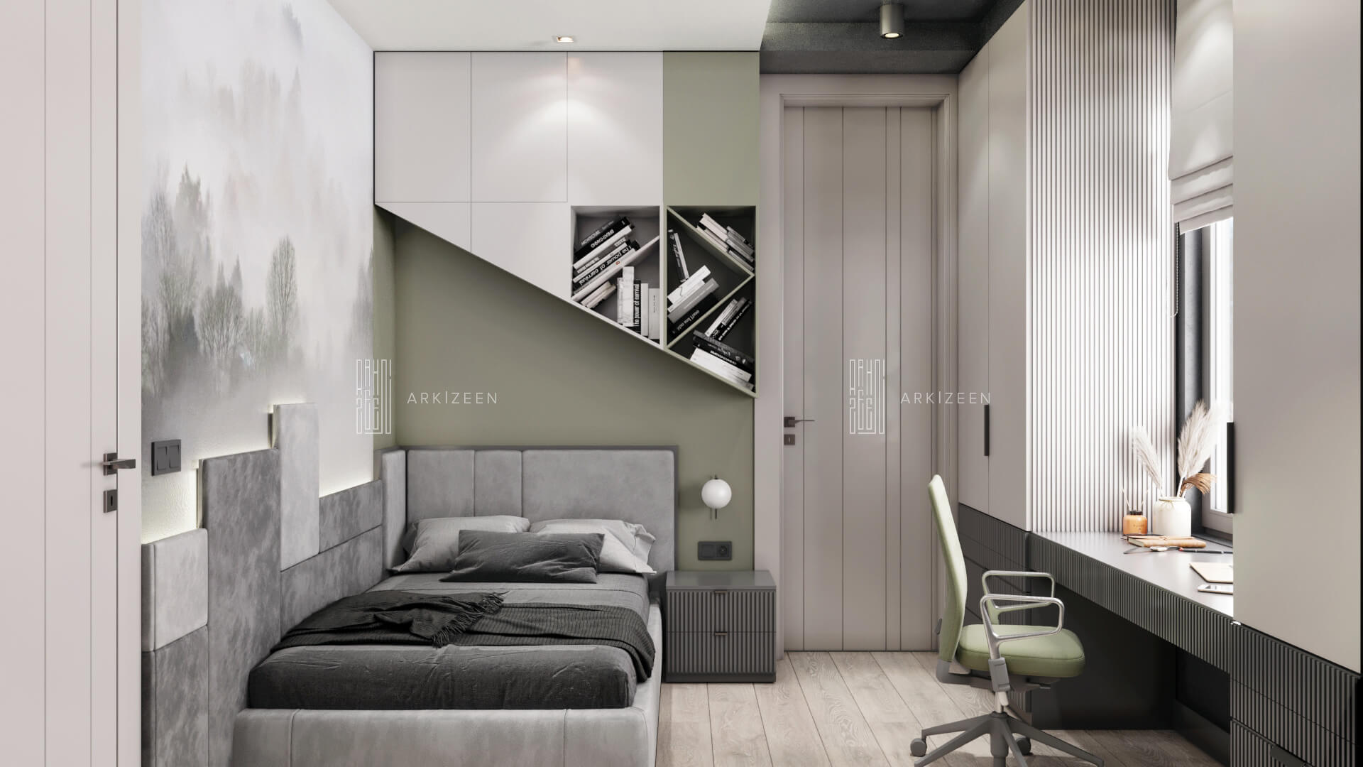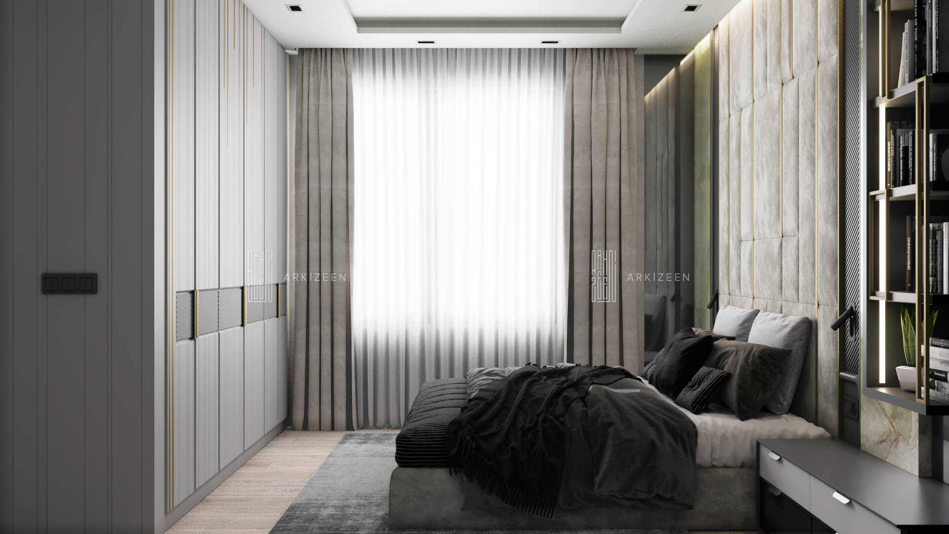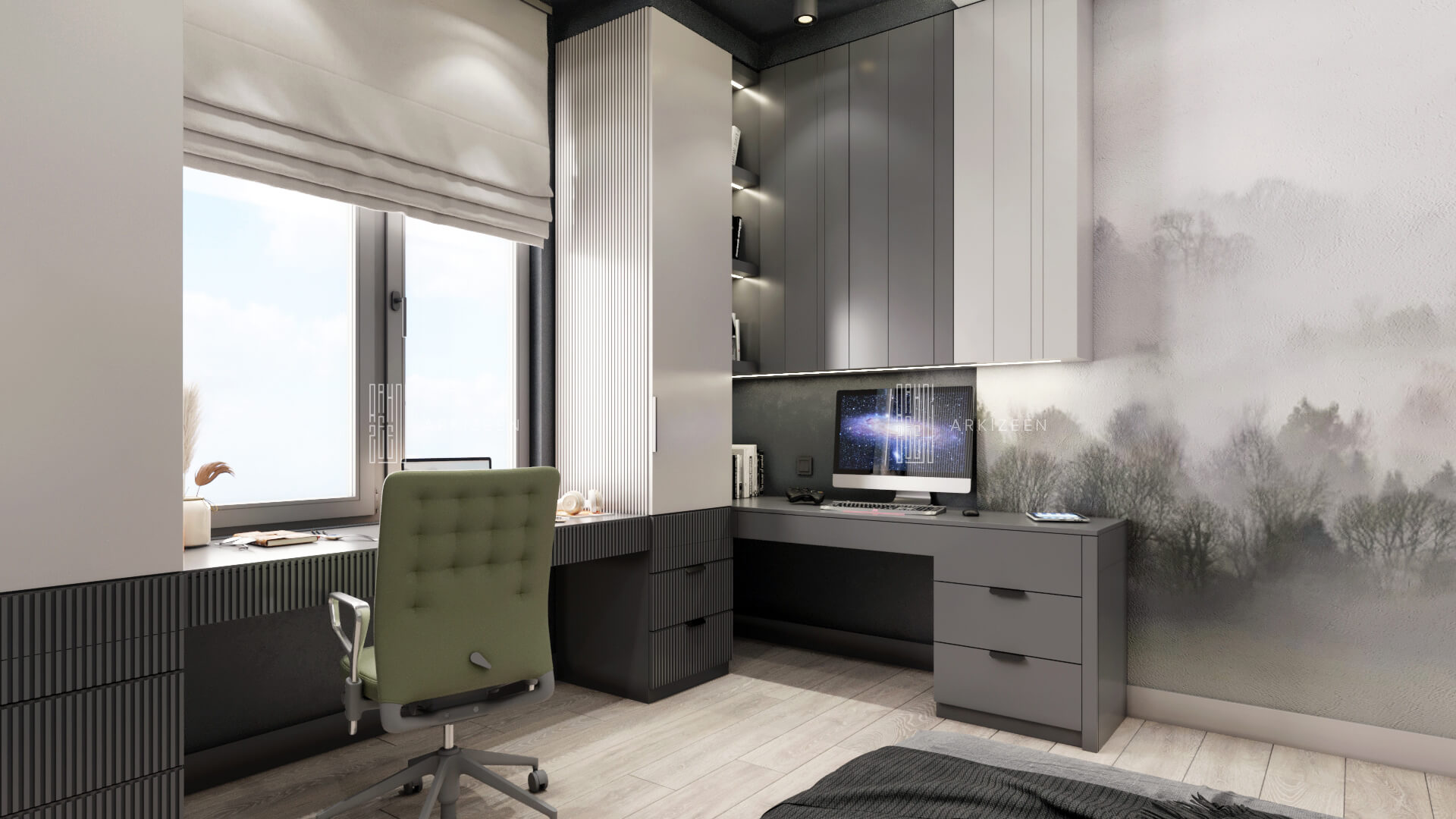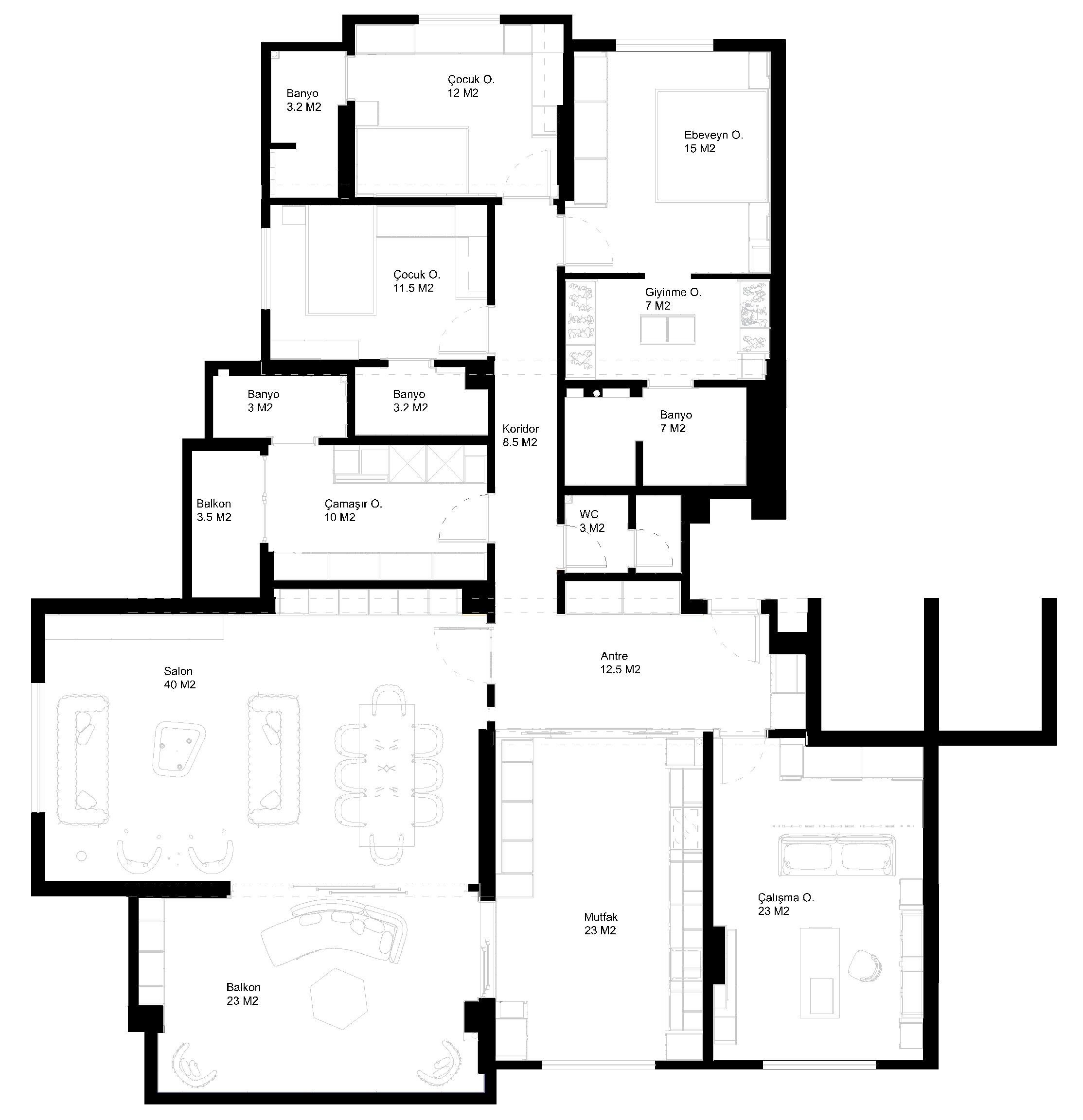 2 çocuk odası, 1 master oda, salon, mutfak ve çalışma odası şeklinde genel planlama yapılmıştır. Mekanlarda mümkün olduğu kadar her noktayı her boşluğu değerlendirecek tasarım anlayışı ile sürdürülmüştür.