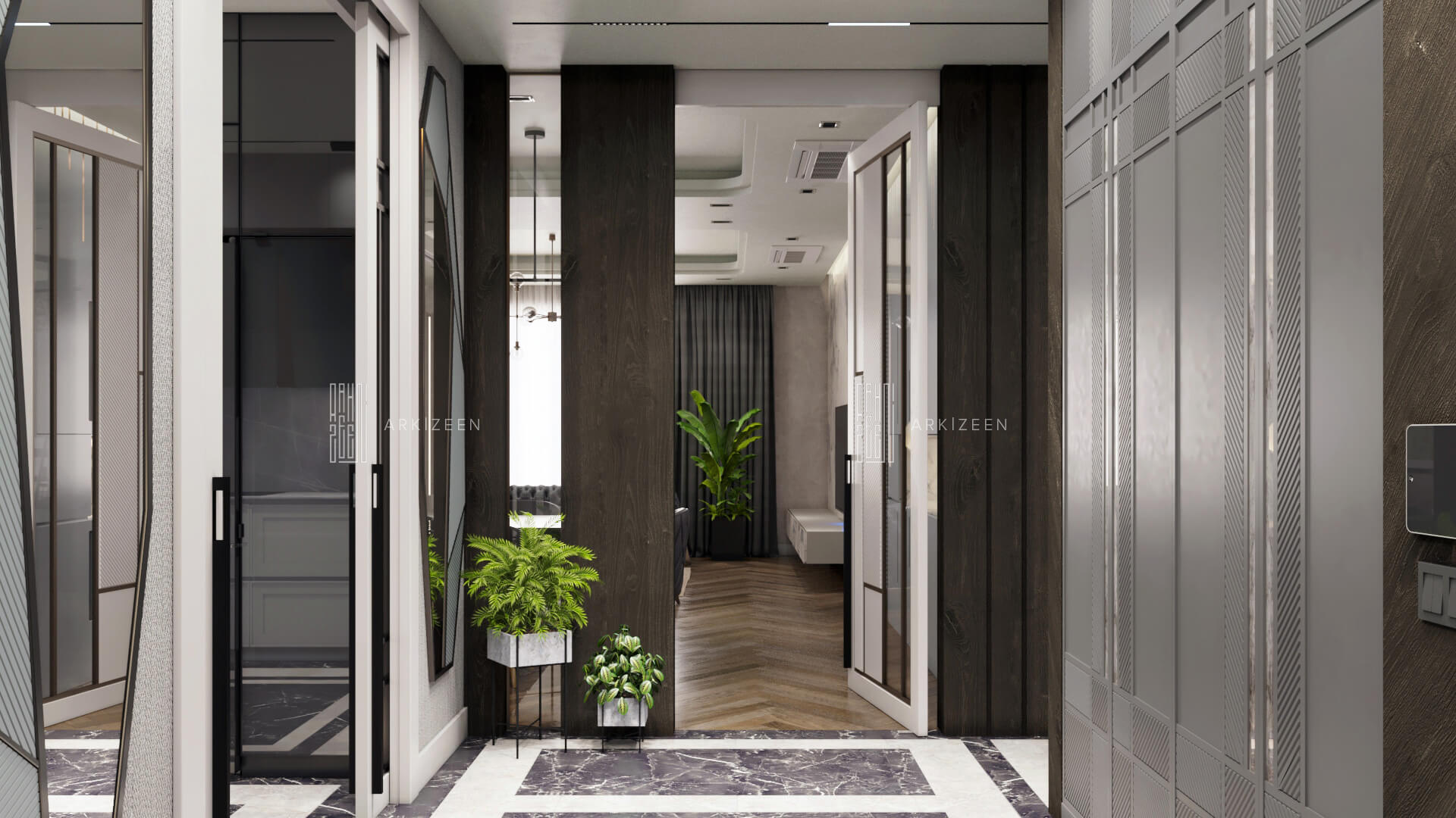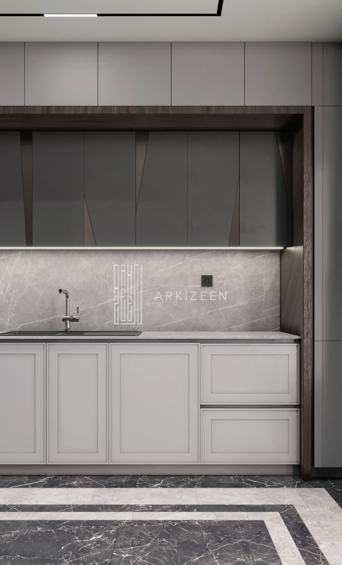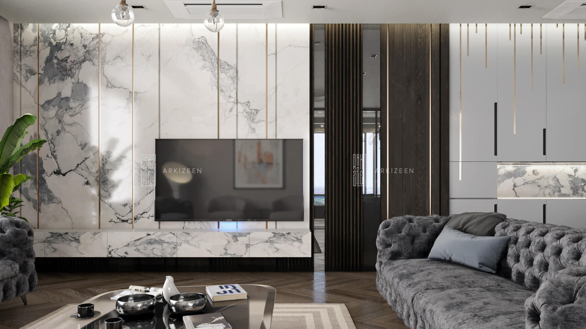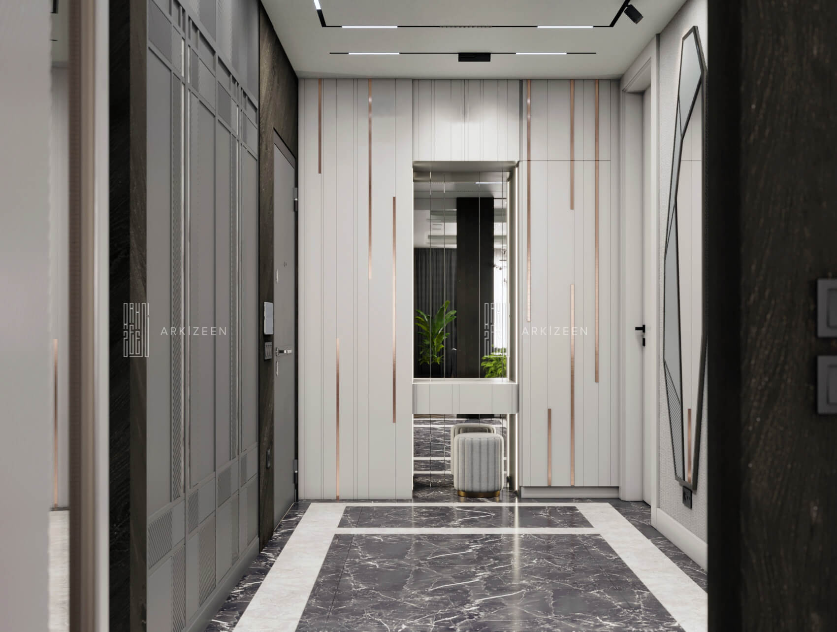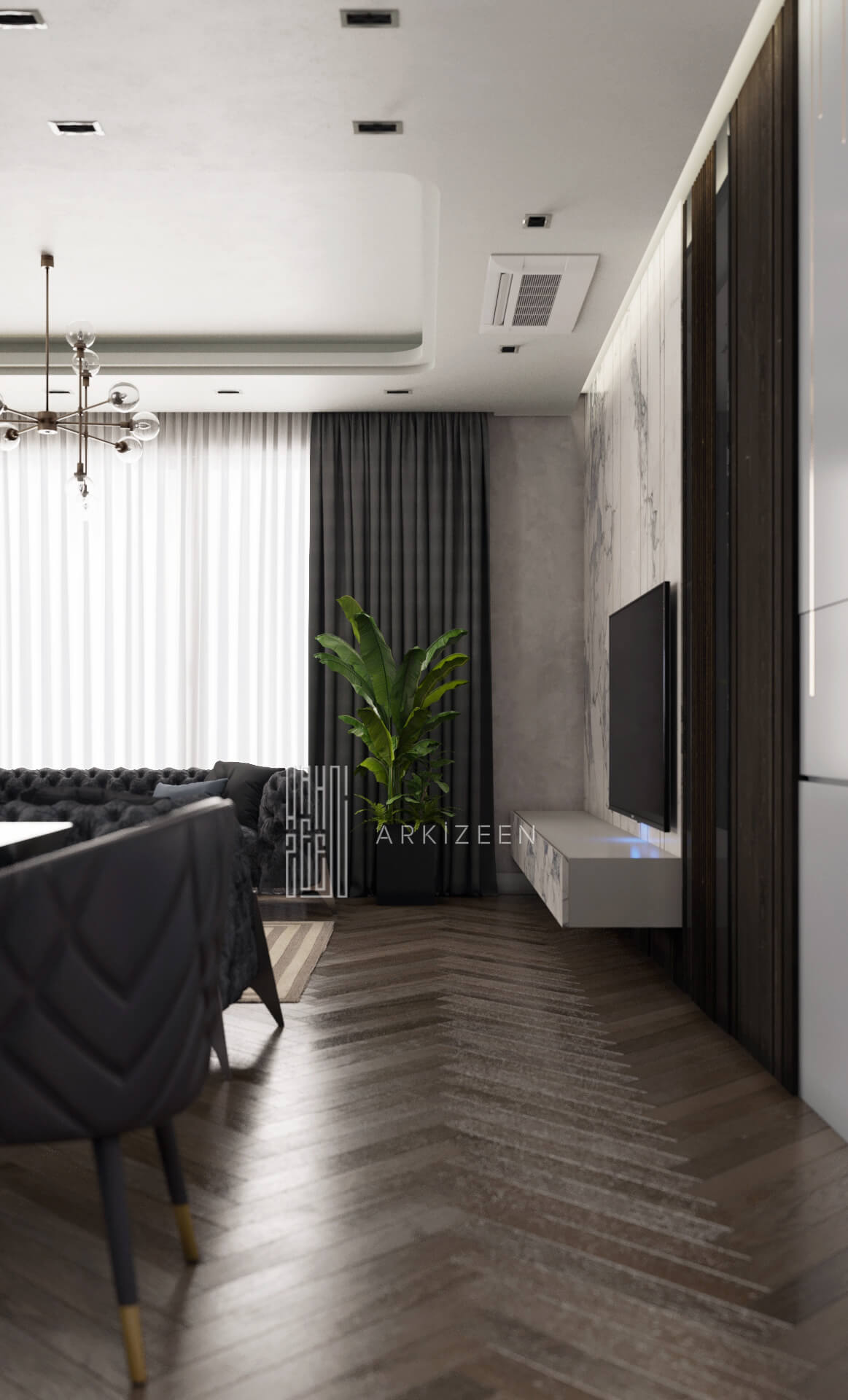 Modern bir tasarım anlayışı ile tasarlanan bu 5+1 daire; metal, ahşap ve mermer malzemelerinin birbiri olan uyumunu göstermek, ekip olarak hedeflerimizden biridir. Duvar tasarımları ile mekanların kendine ait bir kimliği olmasını planladık. Özel yaşam alanları hacim olarak küçük olduğu için mümkün olduğu kadar işlevsel ve ferah olmasına dikkat ettik.