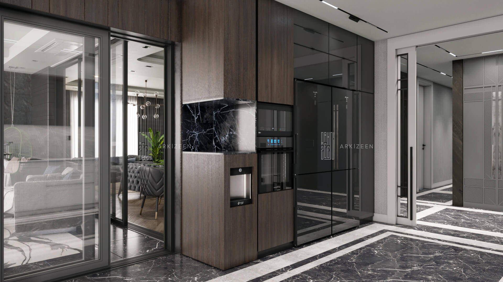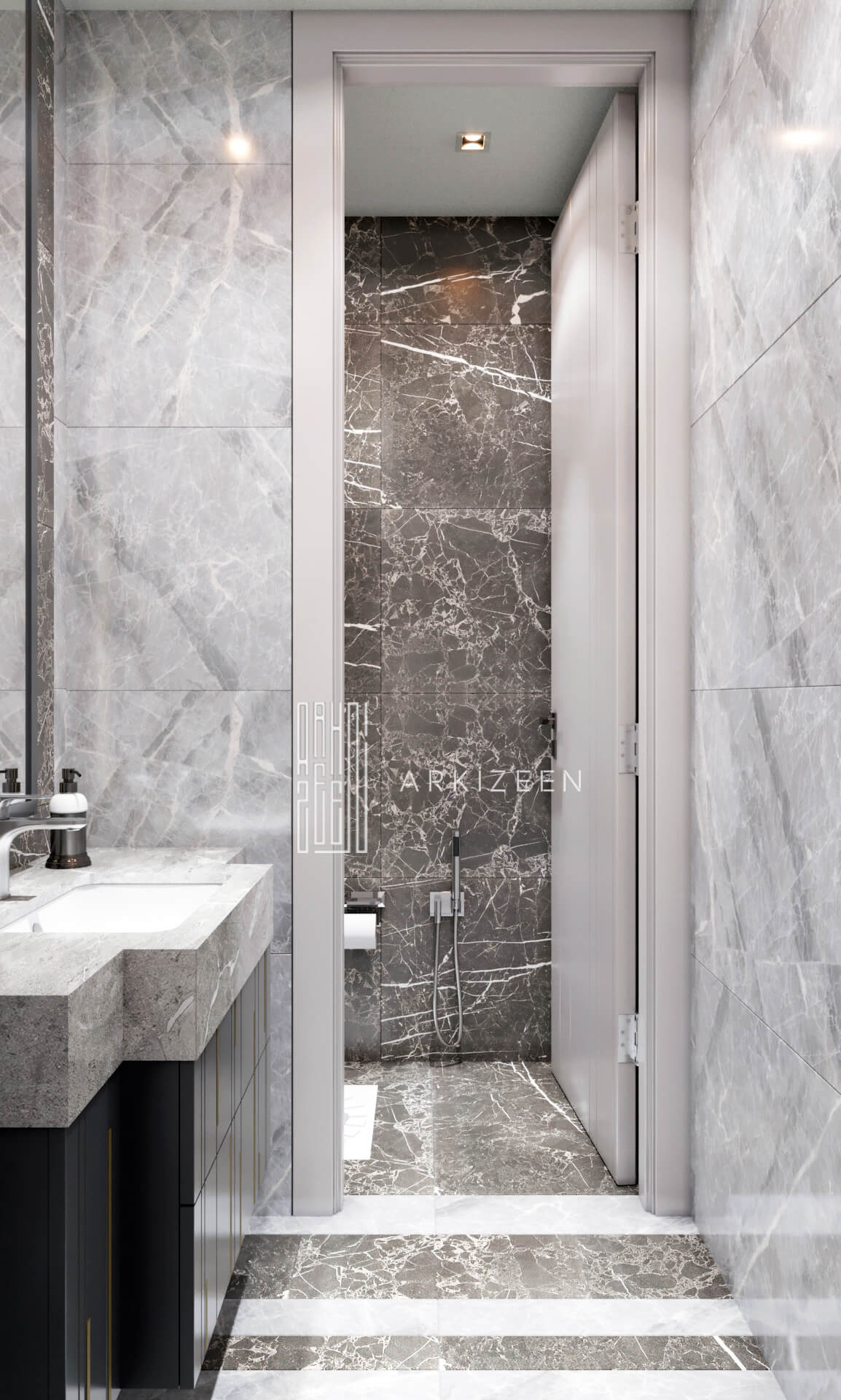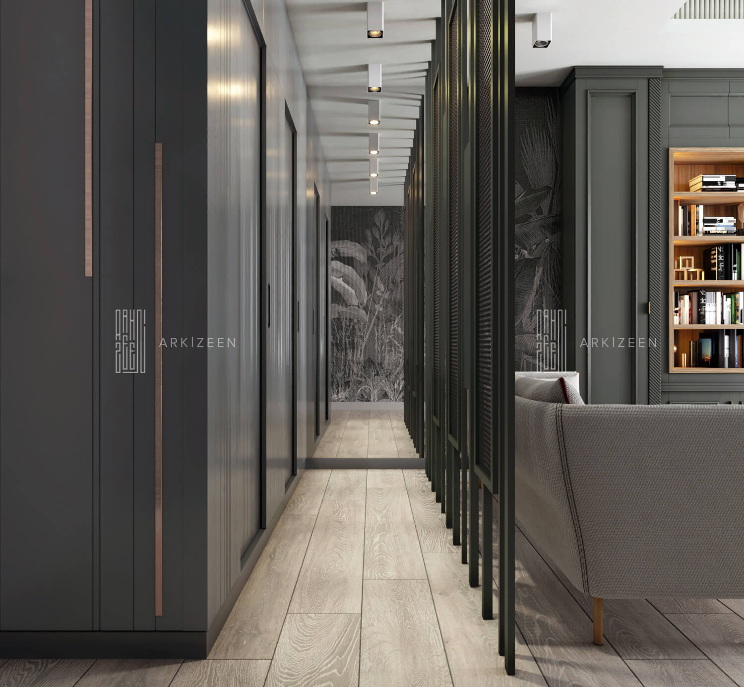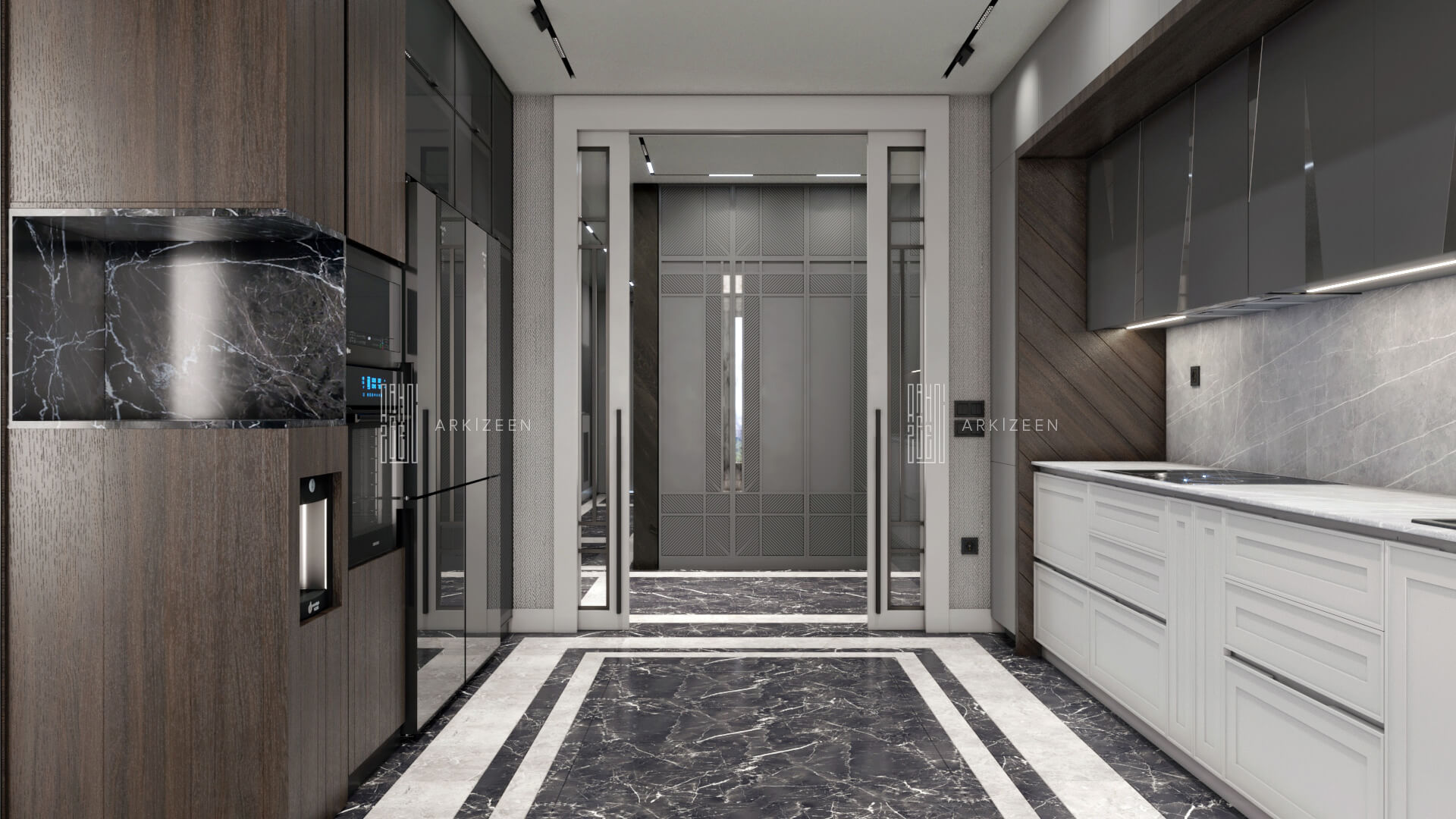 Modern bir tasarım anlayışı ile tasarlanan bu 5+1 daire; metal, ahşap ve mermer malzemelerinin birbiri olan uyumunu göstermek, ekip olarak hedeflerimizden biridir. Duvar tasarımları ile mekanların kendine ait bir kimliği olmasını planladık. Özel yaşam alanları hacim olarak küçük olduğu için mümkün olduğu kadar işlevsel ve ferah olmasına dikkat ettik.