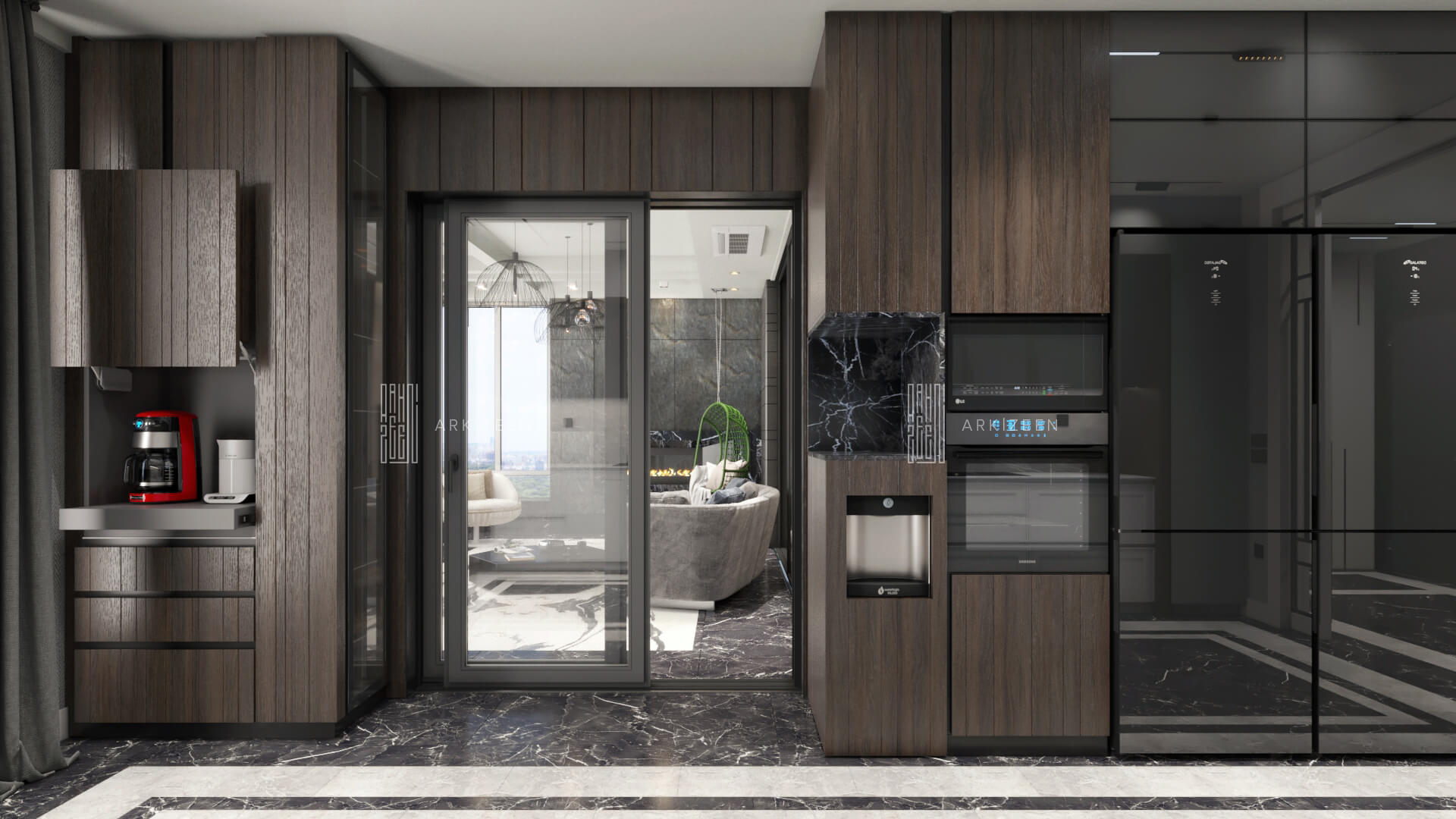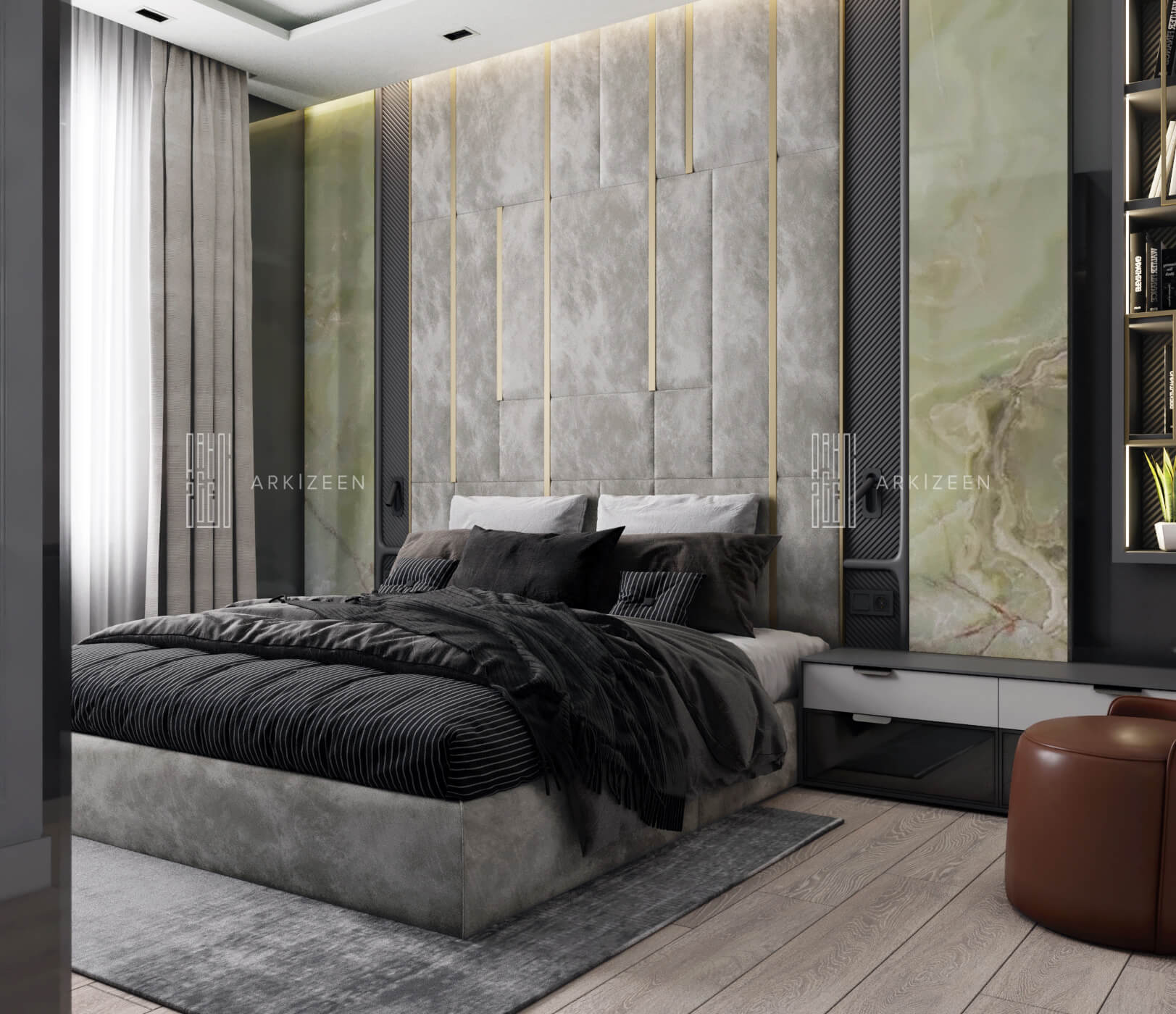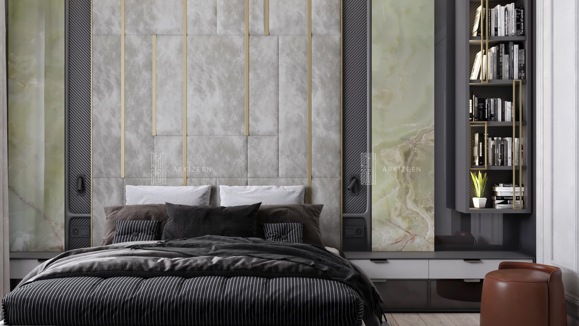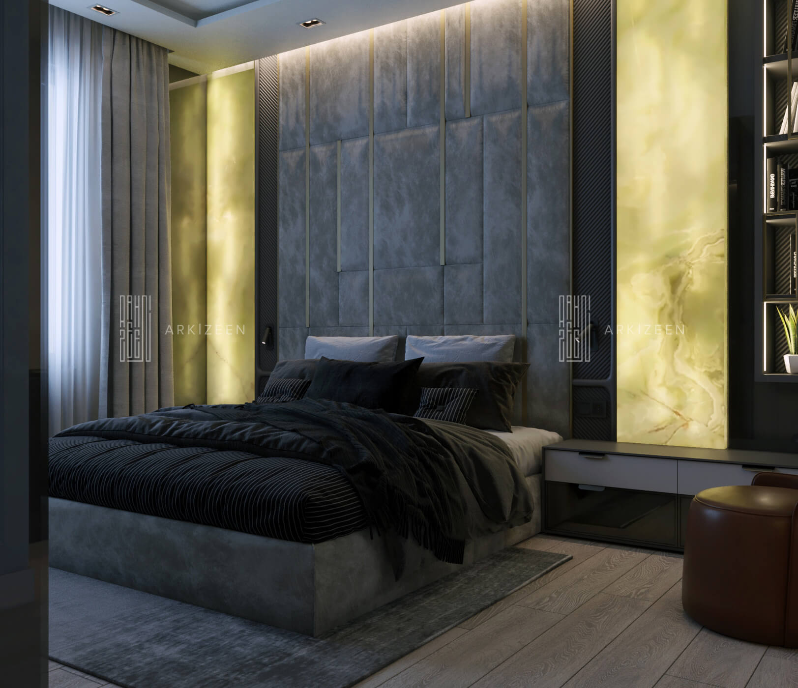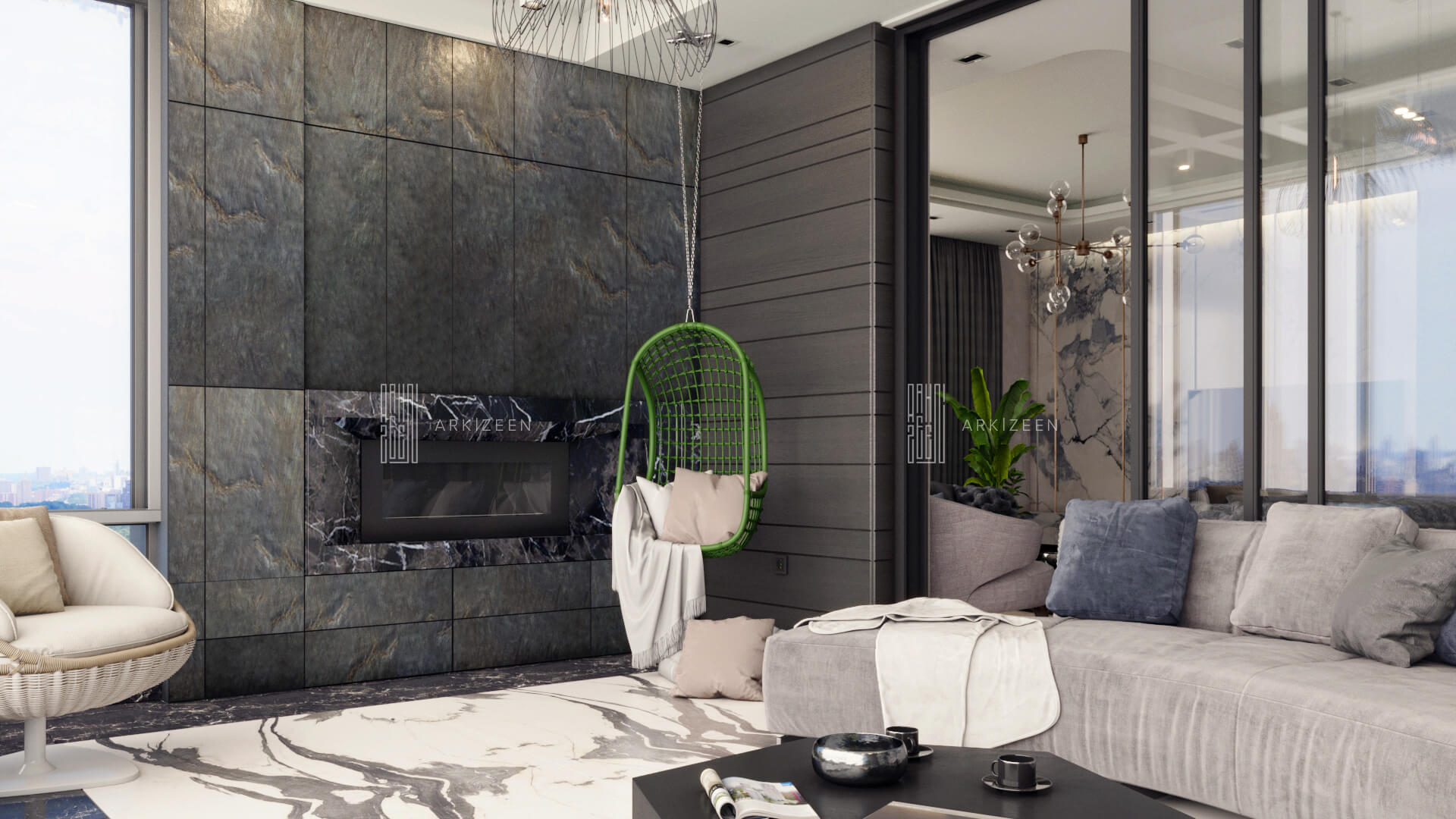 Modern bir tasarım anlayışı ile tasarlanan bu 5+1 daire; metal, ahşap ve mermer malzemelerinin birbiri olan uyumunu göstermek, ekip olarak hedeflerimizden biridir. Duvar tasarımları ile mekanların kendine ait bir kimliği olmasını planladık. Özel yaşam alanları hacim olarak küçük olduğu için mümkün olduğu kadar işlevsel ve ferah olmasına dikkat ettik.