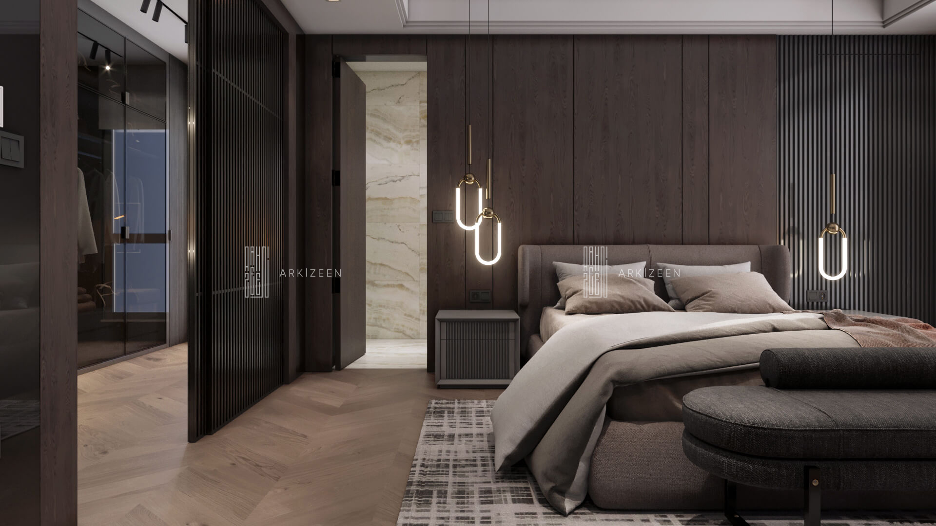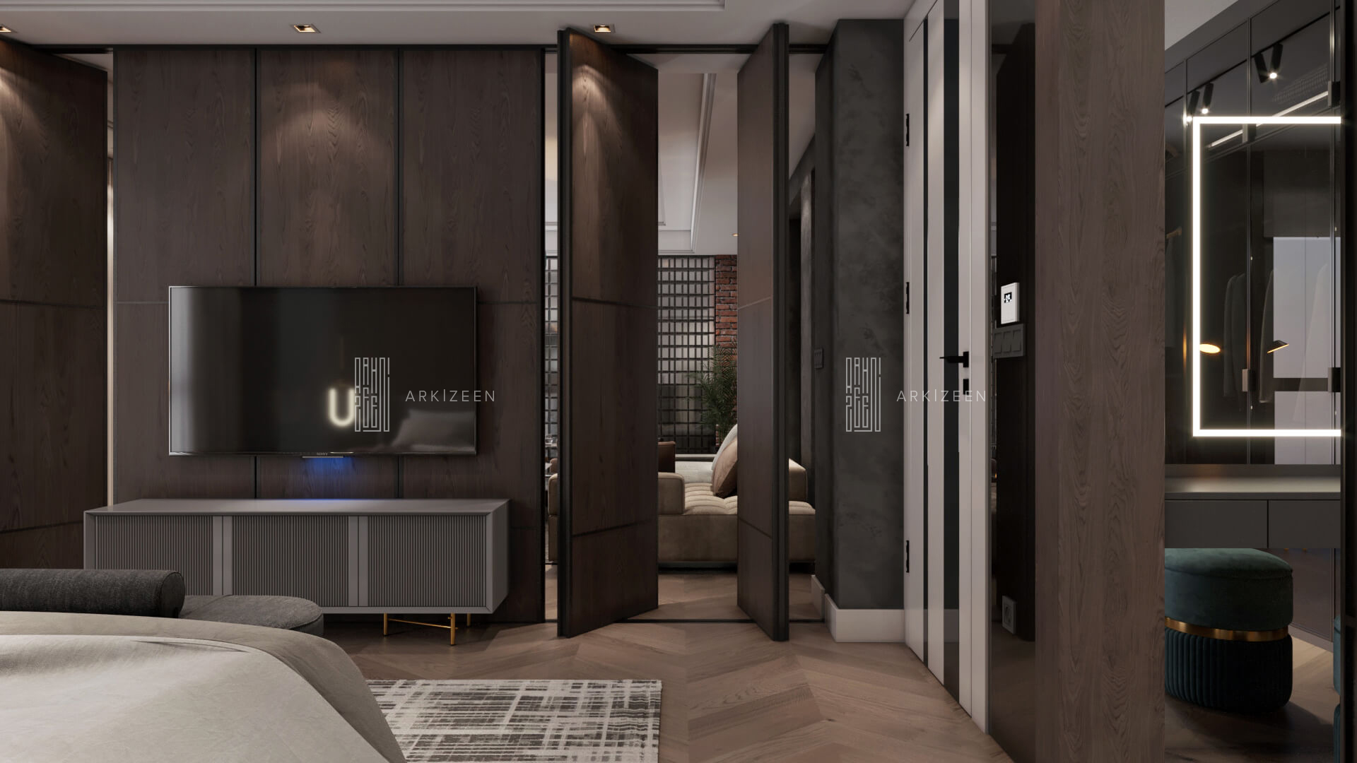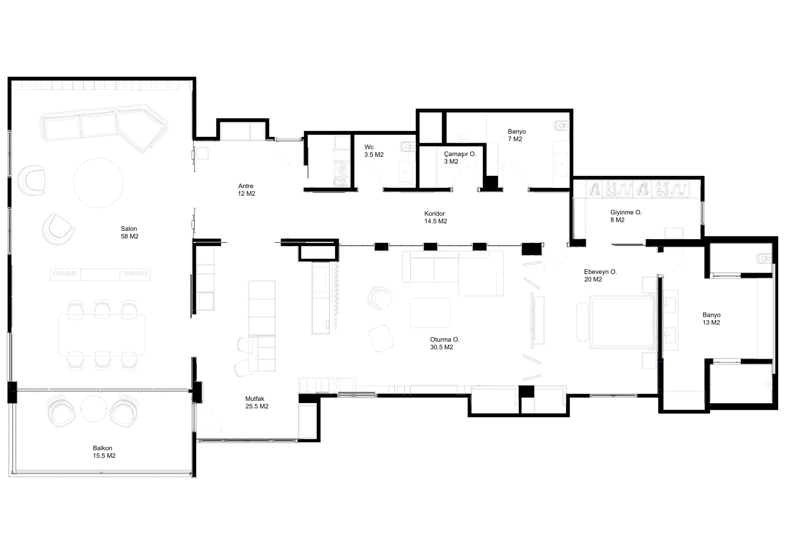 1 master oda, giyinme odası, salon, mutfak ve dinlenme odası şeklinde planlama yapılmıştır. Evin genel planlanması tamamen ev sahibinin özel alanlarını oluşturulacak şekilde tekrar düzenlenmiştir. Açık plan tarzı ile her mekan birbiri arasında ki bağlantıyı hareketli veya yarı şeffaf materyallerle ayrılması ve birleştirilmesi düşünülmüştür.