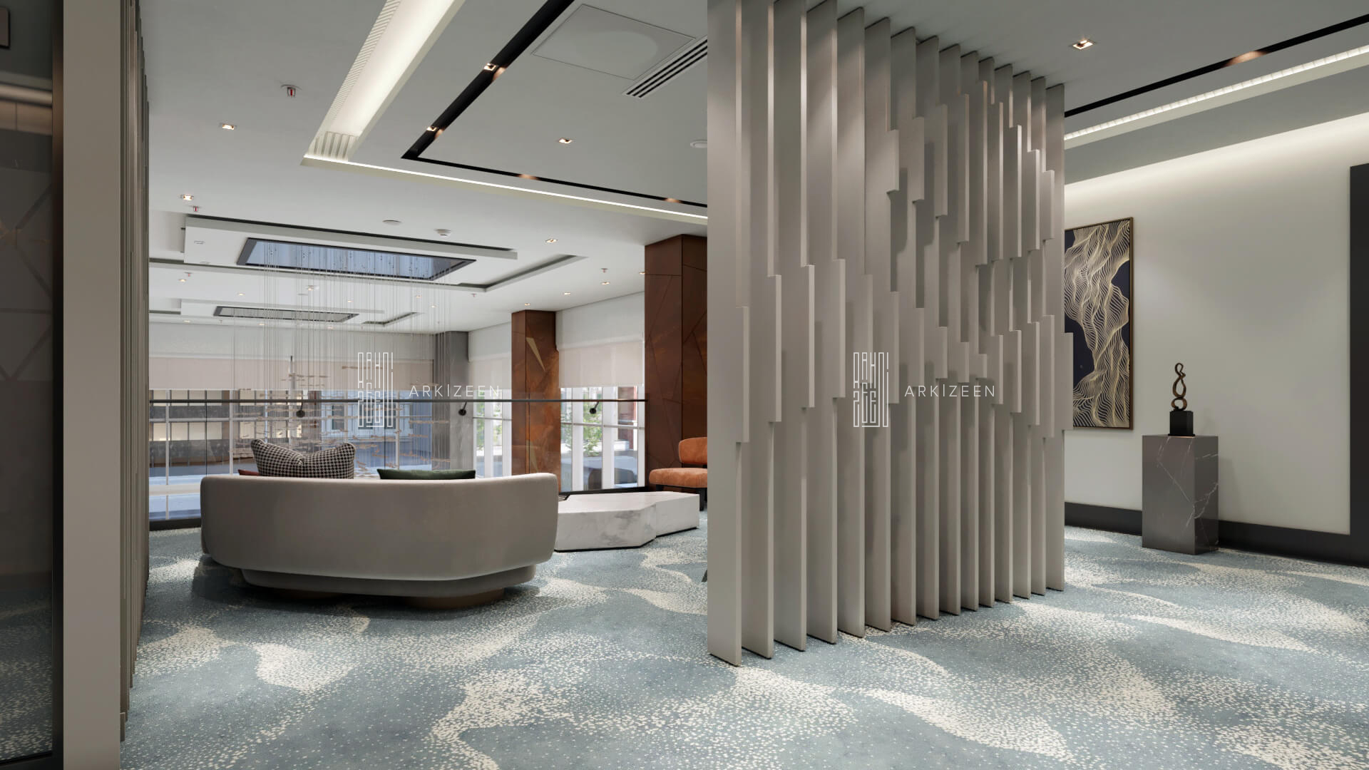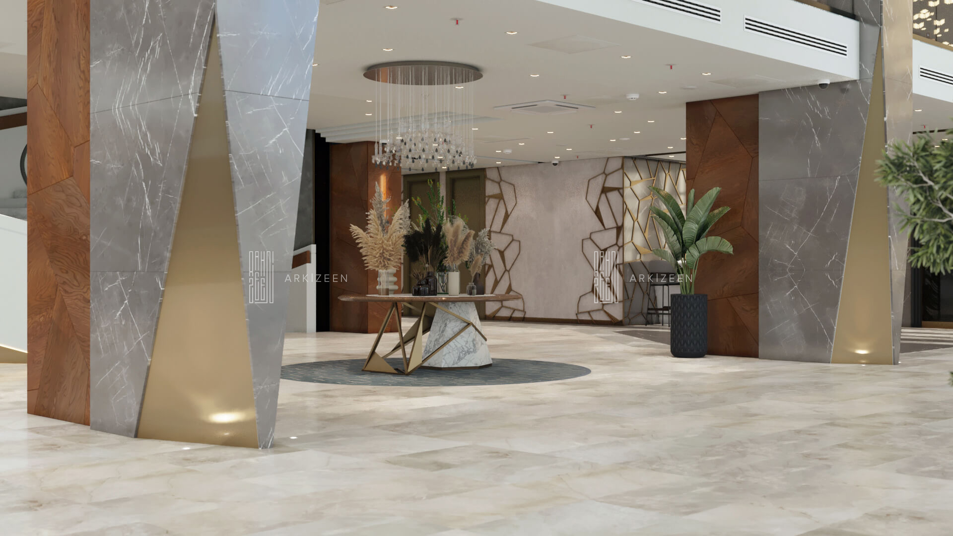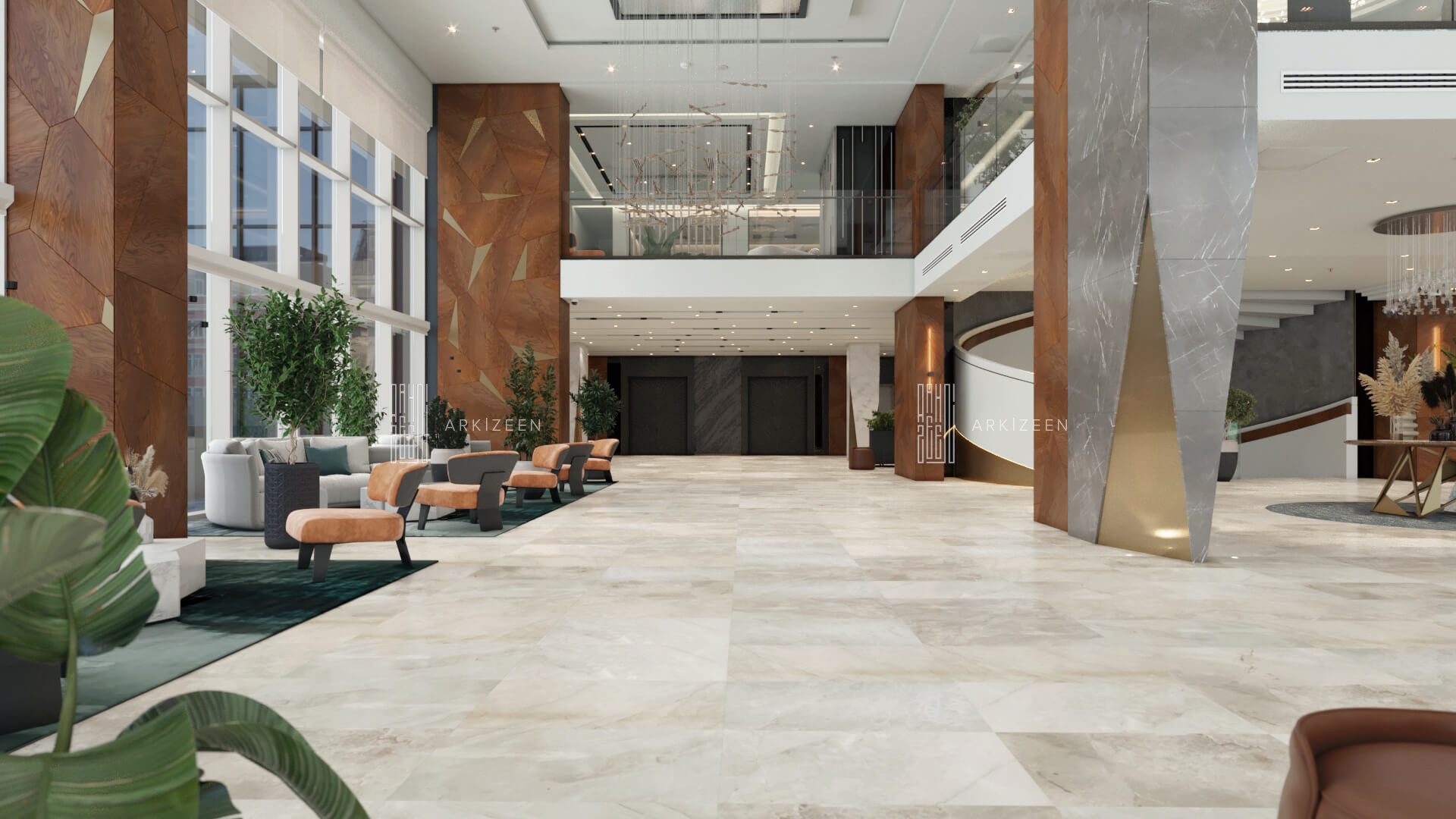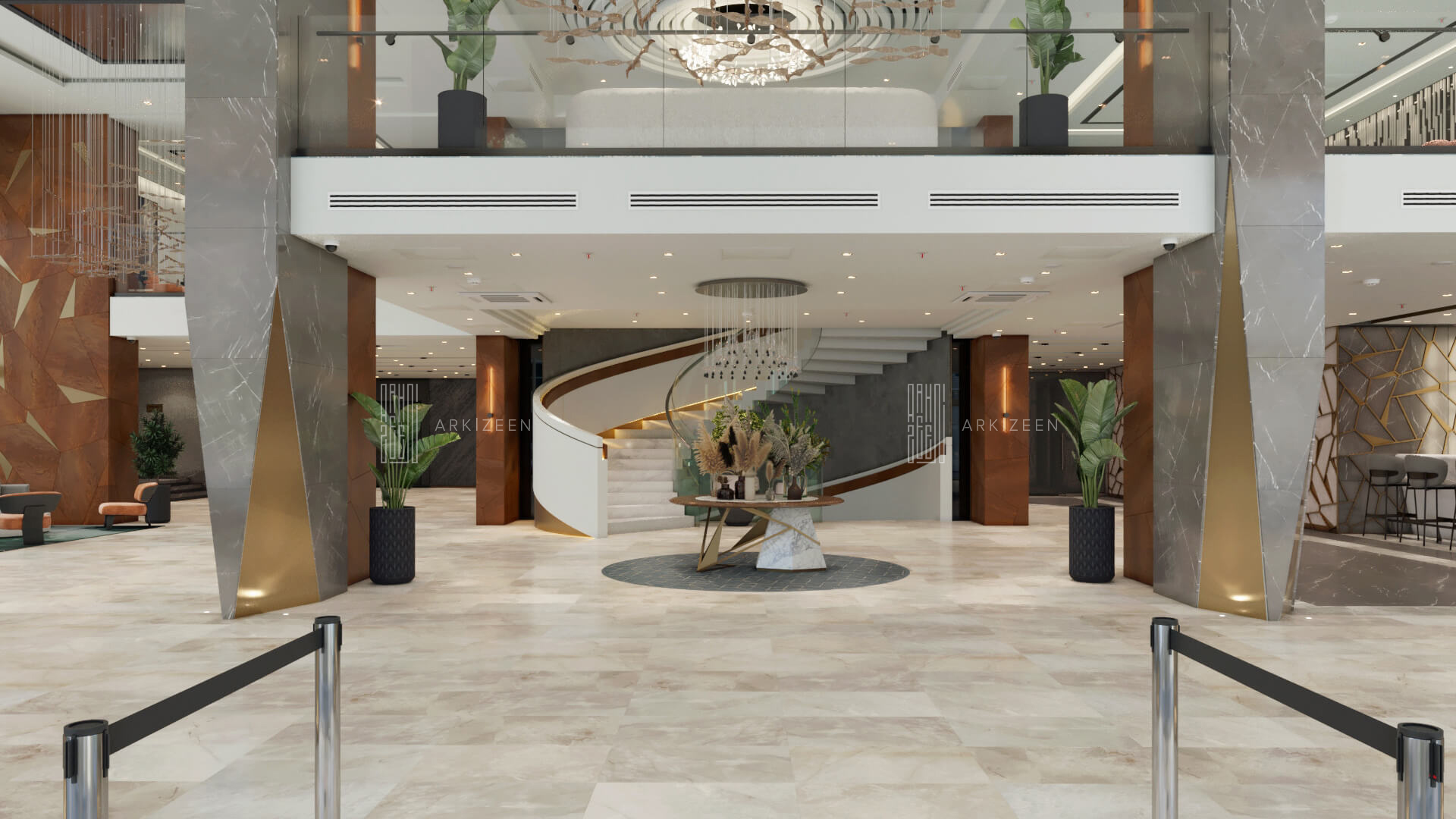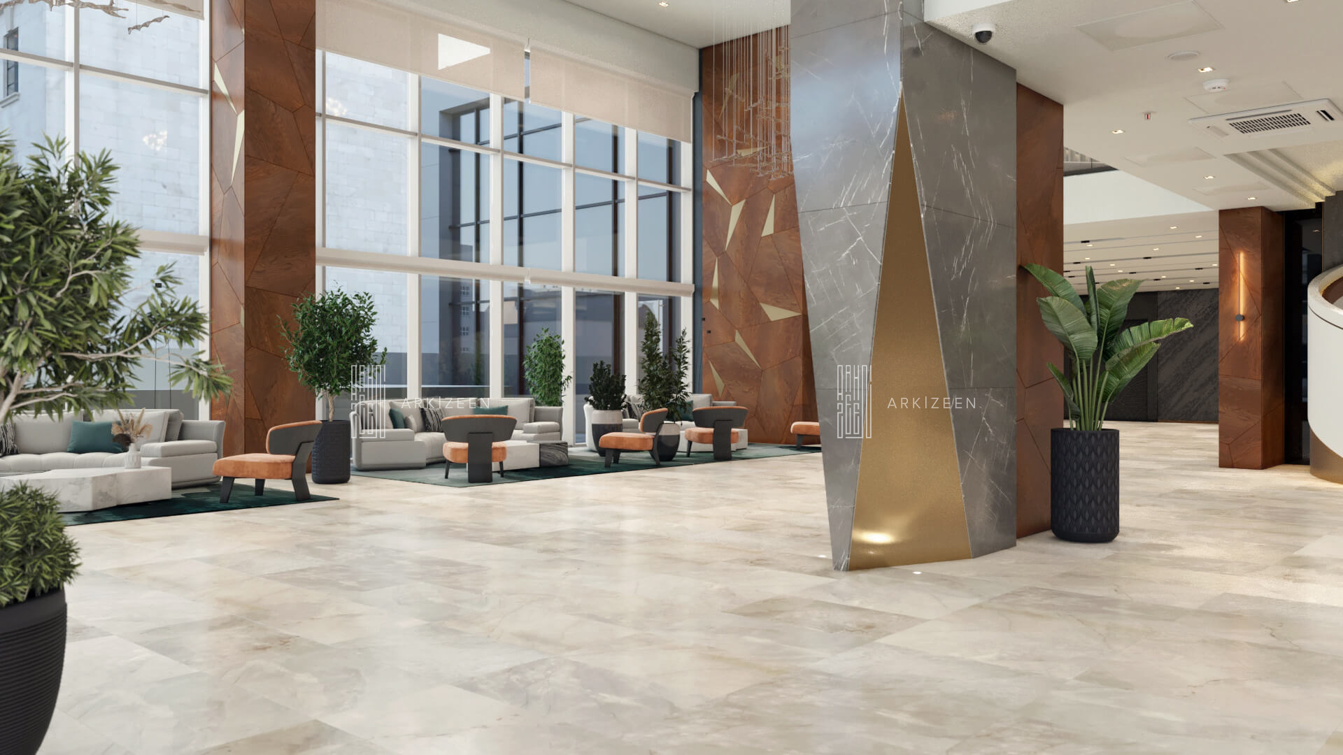 Resepsiyon alanının yeri değiştirilerek lobby düzeninin ana planlanması sağlanmıştır. Resepsiyon alanı, daha ferah bir görünüme sahip olması ile birlikte misafirleri de direk karşılaması hedeflenmiştir. Lobby alanı daha fazla ışığın girmesi için adımlar atılmıştır. Ofis kısımları tekrar düzenlenmiştir. Kolon tasarımlarında ise konsepti yansıtmasına yardımcı olacak mermer ve ahşap malzemenin dokusu yoğun bir şekilde kullanılmıştır. Zeminde kullanılan mermer yerinde bırakılmış ama tüm iç mekandaki unsurlar değiştirilmiştir. Otelin lobby ve asma katı için eski çizgi ve renklerinden çıkarak, yeni renk konsepti ile tasarım detayları düşünülmüştür. Yeni oturum alanlarının eklenmesi, Lobby bar alanının ön plana çıkarılması ve mekana kazandırılması, mevcut merdivenin ufak tasarım dokunuşları ile ortaya çıkarılması sağlanmıştır.