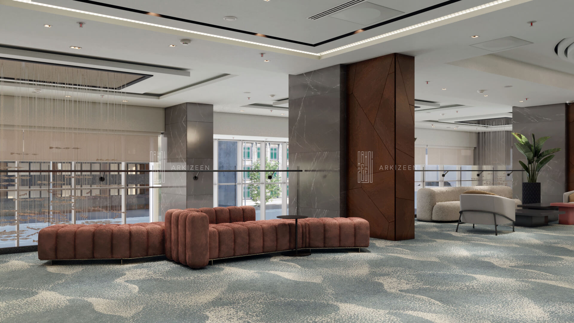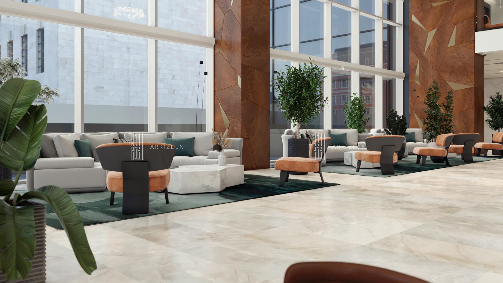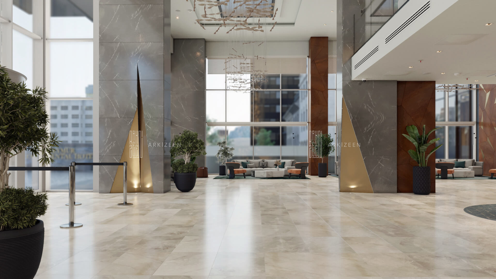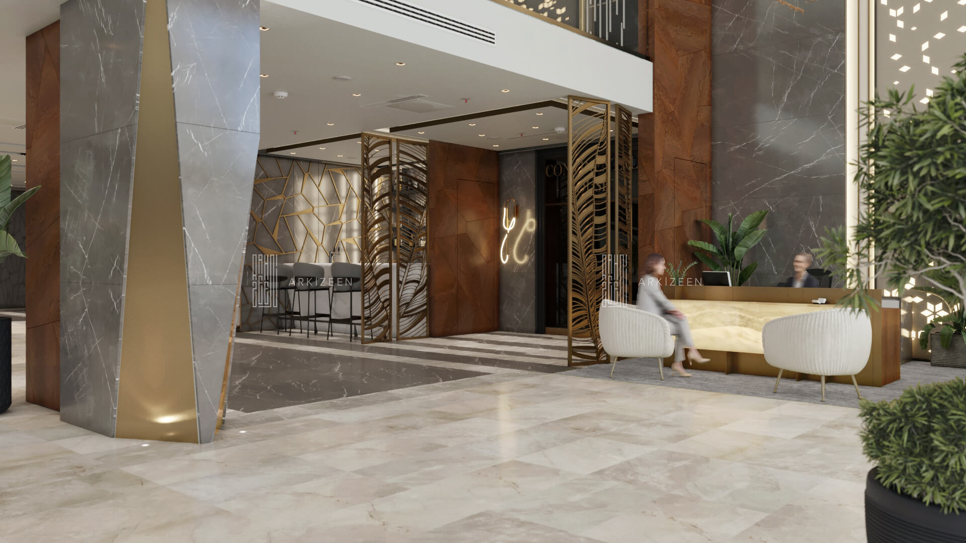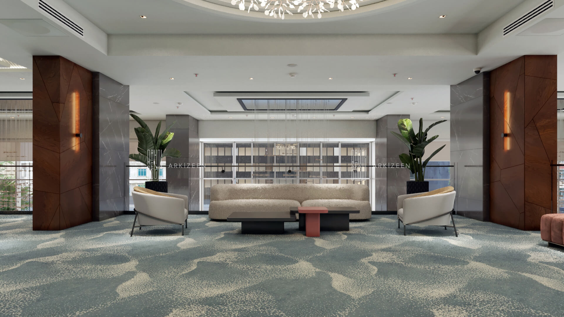 Resepsiyon alanının yeri değiştirilerek lobby düzeninin ana planlanması sağlanmıştır. Resepsiyon alanı, daha ferah bir görünüme sahip olması ile birlikte misafirleri de direk karşılaması hedeflenmiştir. Lobby alanı daha fazla ışığın girmesi için adımlar atılmıştır. Ofis kısımları tekrar düzenlenmiştir. Kolon tasarımlarında ise konsepti yansıtmasına yardımcı olacak mermer ve ahşap malzemenin dokusu yoğun bir şekilde kullanılmıştır. Zeminde kullanılan mermer yerinde bırakılmış ama tüm iç mekandaki unsurlar değiştirilmiştir. Otelin lobby ve asma katı için eski çizgi ve renklerinden çıkarak, yeni renk konsepti ile tasarım detayları düşünülmüştür. Yeni oturum alanlarının eklenmesi, Lobby bar alanının ön plana çıkarılması ve mekana kazandırılması, mevcut merdivenin ufak tasarım dokunuşları ile ortaya çıkarılması sağlanmıştır.