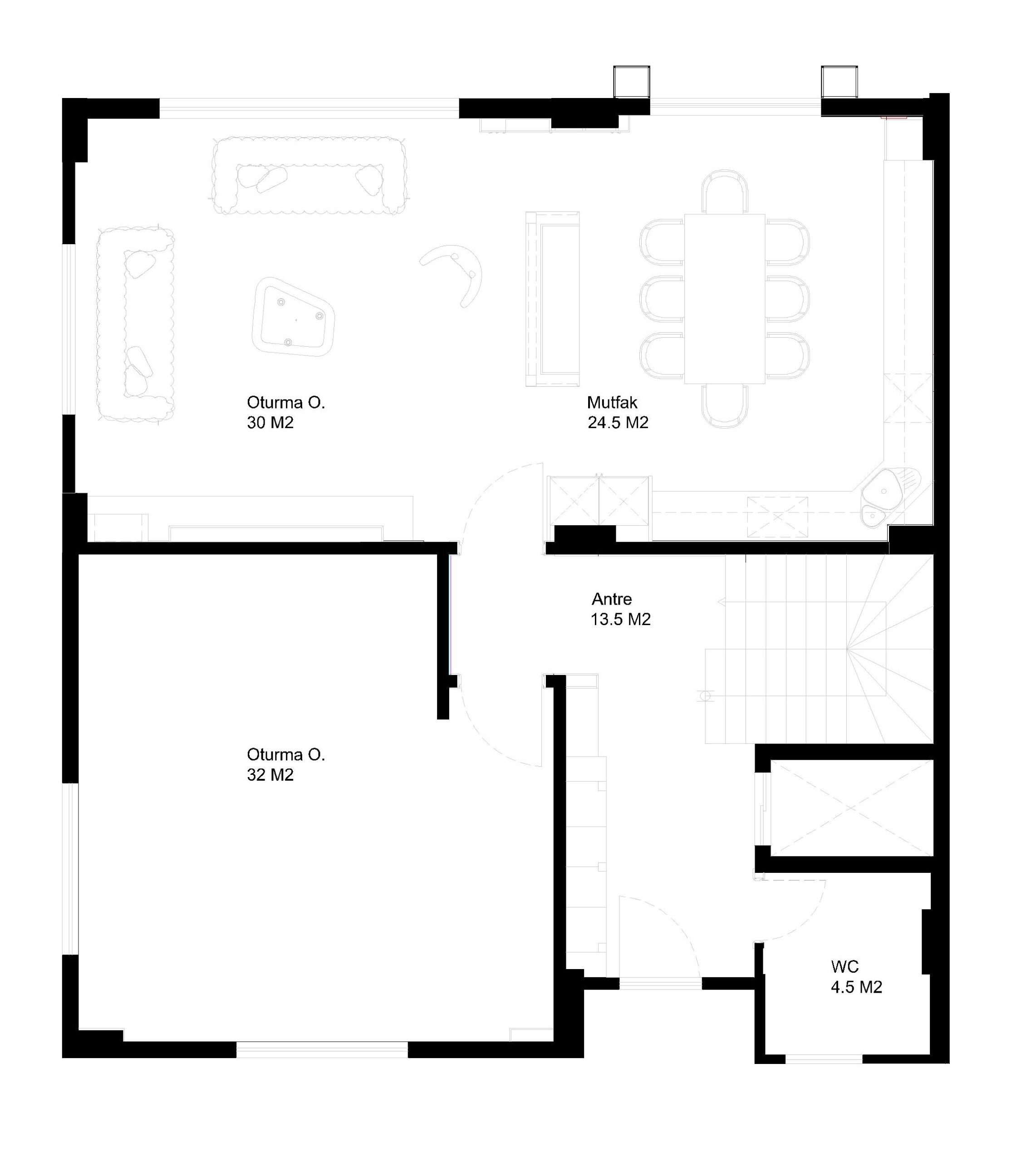 Villa Flora, 2 çocuk odası, 1 master oda, işlevsel ama orta ölçekte tutularak salon ve geniş bi oturma-yemek odası biçiminde planlanmıştır. Yukarı kat tamamen özel yaşam için tasarlanırken, giriş kat ise tamamen bahçe ile bütünleşik işlevsellik ve konfor ön planda tutularak çözüme ulaşılmıştır.